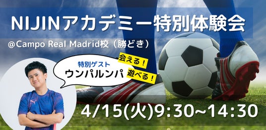 株式会社NIJIN(本社:東京都江東区、代表取締役:星野達郎)と株式会社グローバルフットボールマネジメント(本社:東京都中央区、代表取締役:増田稿平)が運営するレアル・マドリード・ファンデーション・フットボールスクール晴海校並びにそのトレーニング施設「Campo Real Madrid」が共同運営する不登校オルタナティブスクール「NIJINアカデミー」は、インフルエンサーウンパルンパさんを特別ゲストにお迎えした特別体験会を開催することをお知らせいたします。