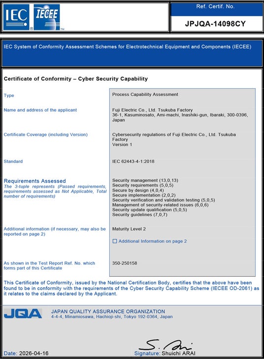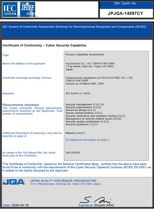一般財団法人日本品質保証機構(本部:東京都千代田区、理事長:石井 裕晶)は、世界50カ国以上で活用されているIECEE CB制度(※1)において、サイバーセキュリティ分野で認証機関(NCB)および試験所(CBTL)の両機能を有する初めての日系認証機関(※2)として第1号および第2号となるCB証明書を、富士電機株式会社(本社:東京都品川区)東京工場および筑波工場に発行しました。(※3)