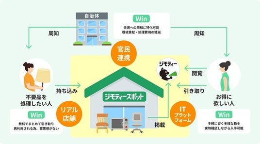 - 市民が不要品をスポットに持ち込み 。持ち込まれた物品はジモティーに掲載・店舗に陳列され、必要とする方へ譲渡・販売。