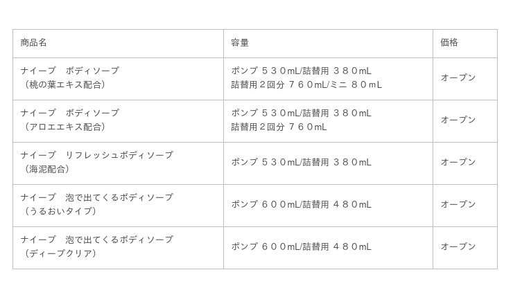 「ナイーブ」は、洗う成分100%植物生まれの泡で、家族みんなの肌をやさしく洗いあげるボディソープです。今回のリニューアルにあたり、“家族みんなのお肌を想う”基本コンセプトはそのままに、各アイテムの特長を際立たせる成分を新配合して機能を強化。さらに、パッケージの前面に分かりやすく機能を表記することで、より選びやすい商品に生まれ変わりました。