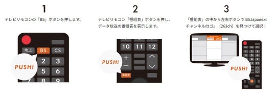 3.「番組表」の中から左右ボタンで 「BSJapanext チャンネルロゴ」(263ch)を見つけて選択