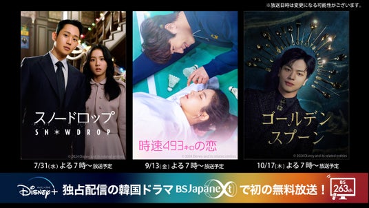 BS放送局『BSJapanext(読み:ビーエスジャパネクスト)』(BS263ch)にて、ディズニープラス独占配信の韓国ドラマ3作品が全話無料で放送決定!7月31日(水)より、毎週月曜~金曜よる7時の放送枠にてBLACKPINKジス主演ドラマ「スノードロップ」、TBSドラマで人気急上昇のチェ・ジョンヒョプ主演ドラマ「時速493キロの恋」、人気WEBトゥーン漫画原作でBTOBユク・ソンジェ主演の「ゴールデンスプーン」など、注目の作品を放送!これらの作品をディズニープラスの配信以外で放送するのは初!