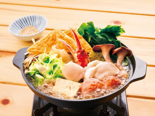 本ずわい蟹やほたてなどの魚介と250g以上の野菜を卓上で煮込みながら、たっぷりのすりごまで召し上がってください。