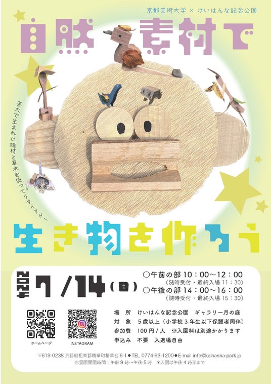 京都芸術大学総合造形コース・けいはんな記念公園 7月14日(日)ワークショップ「自然素材で生き物たちを作ろう!」自然の素材と学生の材料を用いて生き物たちのミニオブジェを作ります。