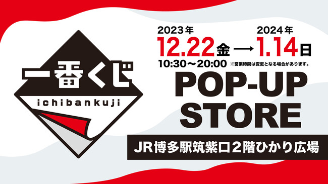 オリジナル商品の企画・制作・販売を軸に、企業・組織のトータルブランディングを手掛ける株式会社ヘソプロダクション(本社:大阪市福島区・代表取締役:稲本ミノル)は、2023年12月22日(金)から2024年1月14日(日)までの間、JR博多駅 筑紫口2階 ひかり広場「EKIHAKO」にて、 「一番くじPOP-UP STORE」 を期間限定開催いたします。