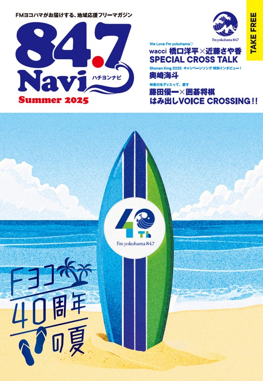 今回のフリーマガジンのテーマは、「Fヨコ40周年の夏」。FMヨコハマ開局40周年を記念したアニバーサリーソング「EARS」を手がけたwacciの橋口洋平と「Lovely Day(ハート)」DJ・近藤さや香の同い年コンビによるスペシャル対談が実現!さらに、藤田優一と囲碁将棋による「はみだしVOICE CROSSING」では、神奈川への愛と、ユーモラスな“ディスり”も交えた熱いスペシャル対談も!そして、今年のSummer Campaignソングを書き下ろしてくれた奥崎海斗の特別インタビューなど、今回も内容盛りだくさんでお届けします。