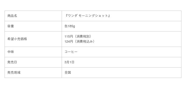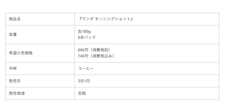 『ワンダ モーニングショット』は2002年の発売以来“朝専用 缶コーヒー”をコンセプトに“焼きたて・挽きたて・淹れたて”にこだわった朝にふさわしいスッキリした飲み心地を追求した朝専用缶コーヒーとして長年支持をいただいております。今回の缶形状変更に伴い今後は味わいだけでなく環境負荷低減にも貢献することでより一層のブランドの価値向上を目指していきます。