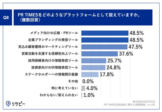 「Q8.PR TIMESをどのようなプラットフォームとして捉えていますか。(複数回答)」(n=101)と質問したところ、「メディア向けの広報・PRツール」が48.5%、「企業ブランディングの発信ツール」が48.5%、「見込み顧客獲得のマーケティングツール」が47.5%という回答となりました。