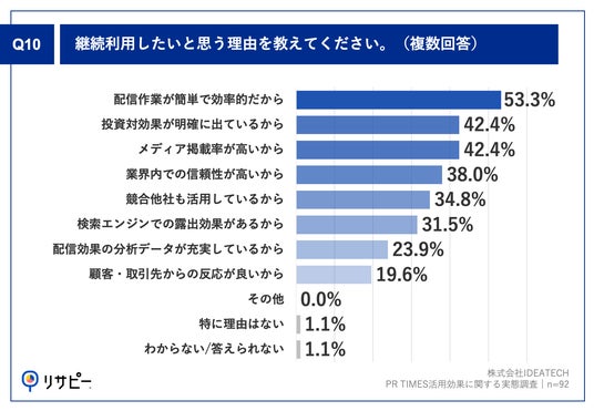 Q9で「非常にそう思う」「ややそう思う」と回答した方に、「Q10.継続利用したいと思う理由を教えてください。(複数回答)」(n=92)と質問したところ、「配信作業が簡単で効率的だから」が53.3%、「投資対効果が明確に出ているから」が42.4%、「メディア掲載率が高いから」が42.4%という回答となりました。