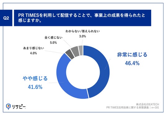 「Q2.PR TIMESを利用して配信することで、事業上の成果を得られたと感じますか。」(n=101)と質問したところ、「非常に感じる」が46.4%、「やや感じる」が41.6%という回答となりました。