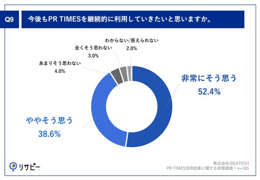 「Q9.今後もPR TIMESを継続的に利用していきたいと思いますか。」(n=101)と質問したところ、「非常にそう思う」が52.4%、「ややそう思う」が38.6%という回答となりました。