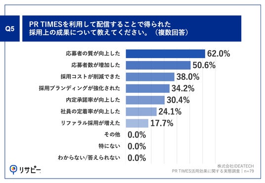 Q4で「非常に感じる」「やや感じる」と回答した方に、「Q5.PR TIMESを利用して配信することで得られた採用上の成果について教えてください。(複数回答)」(n=79)と質問したところ、「応募者の質が向上した」が62.0%、「応募者数が増加した」が50.6%、「採用コストが削減できた」が38.0%という回答となりました。