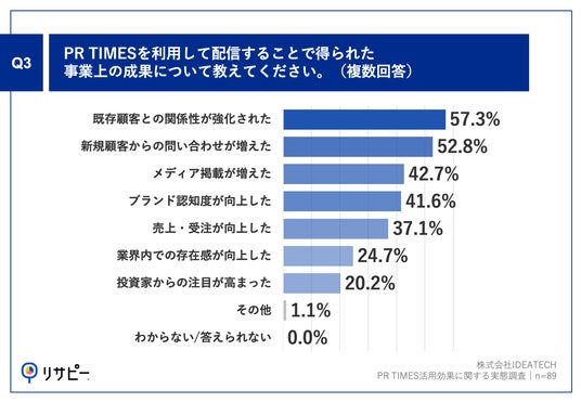 Q2で「非常に感じる」「やや感じる」と回答した方に、「Q3.PR TIMESを利用して配信することで得られた事業上の成果について教えてください。(複数回答)」(n=89)と質問したところ、「既存顧客との関係性が強化された」が57.3%、「新規顧客からの問い合わせが増えた」が52.8%、「メディア掲載が増えた」が42.7%という回答となりました。