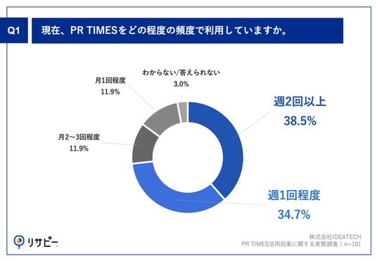 「Q1.現在、PR TIMESをどの程度の頻度で利用していますか。」(n=101)と質問したところ、「週2回以上」が38.5%、「週1回程度」が34.7%という回答となりました。