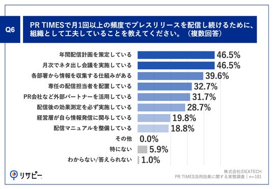 「Q6.PR TIMESで月1回以上の頻度でプレスリリースを配信し続けるために、組織として工夫していることを教えてください。(複数回答)」(n=101)と質問したところ、「年間配信計画を策定している」が46.5%、「月次でネタ出し会議を実施している」が46.5%、「各部署から情報を収集する仕組みがある」が39.6%という回答となりました。