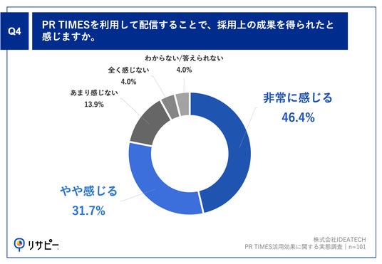 「Q4.PR TIMESを利用して配信することで、採用上の成果を得られたと感じますか。」(n=101)と質問したところ、「非常に感じる」が46.4%、「やや感じる」が31.7%という回答となりました。