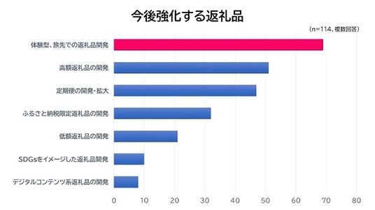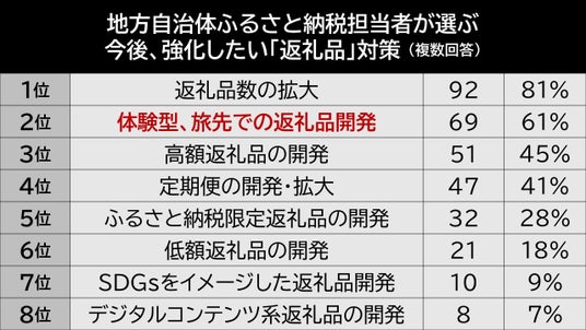 ◆今後強化したい返礼品は「体験型、旅先での返礼品開発」と回答した自治体が全体の61%で、ふるさと納税を通じて地域に人を呼び込みたいと考えている