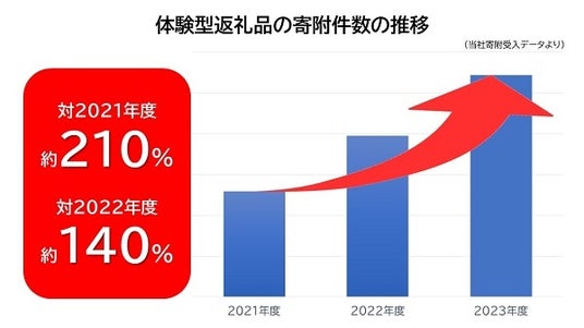 また、昨年の約2倍の回答を集めたのが「旅行・観光などの体験型返礼品への需要拡大」でした。これは、2023年5月に新型コロナウイルス感染症の「5類感染症」への移行を受けて、旅行需要が拡大したことによる影響と考えられます。当社が2023年度に取り扱った寄附でも「体験型返礼品」は対2021年度で約210%、対2022年度で約140%(共に件数ベース)と大きく伸びています。