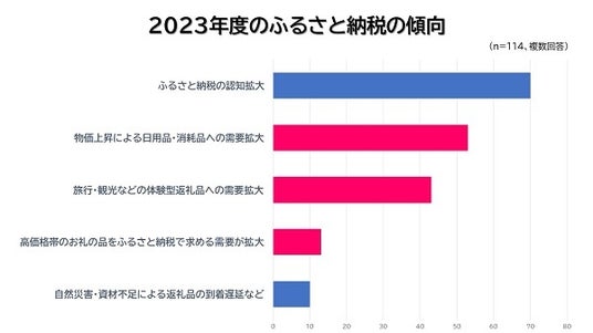2023年度のふるさと納税の傾向を尋ねたところ、昨年のアンケート同様に「ふるさと納税の認知拡大」と「物価上昇による日用品・消耗品への需要拡大」を多くの担当者が挙げました。