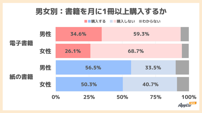 書籍を月1冊以上購入する人の割合は、女性より男性の方が大きい。