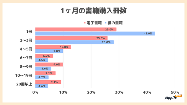 紙の書籍では「1冊」が42.9%で圧倒的に多いです。一方で電子書籍は「1冊」が29.0%で、紙の書籍に比べて13.9ポイントも低くなっています。逆に4冊以上の回答割合は紙の書籍よりも電子書籍の方が大きく、20冊以上購入している人は9.1%いました。