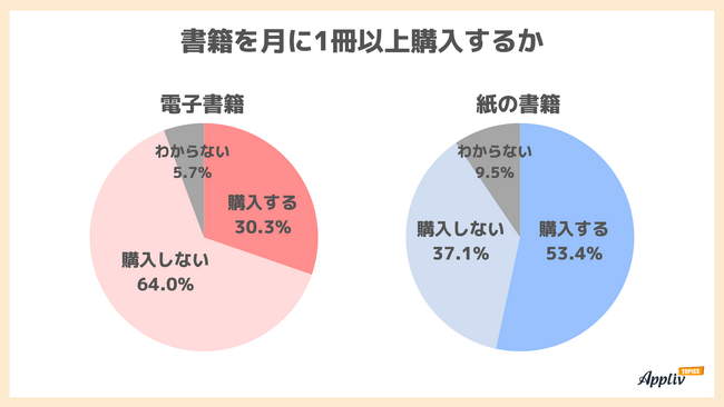 書籍を月1冊以上購入する人は、電子書籍が30.3%、紙の書籍が53.4%。