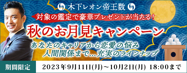 テレシスネットワーク株式会社(本社:東京都港区、代表取締役:鷹石惠充 https://www.telsys.co.jp/)は、2023年9月11日(月)より、月額公式サイト『木下レオン◆帝王数』にて、豪華プレゼントが当たる『秋のお月見キャンペーン』を公開いたします。