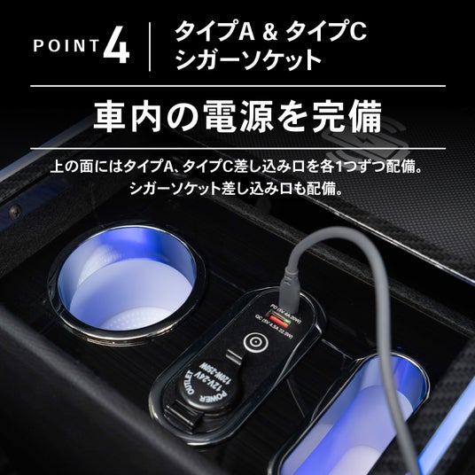 タイプA、タイプCのUSB差し込み口とシガーソケットを各1つずつ完備。お手持ちのデバイスを車内で簡単に充電でき、長時間のドライブも快適です。