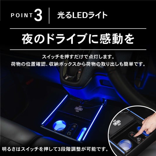 夜間のドライブでもスイッチ一つで点灯。荷物の位置や収納ボックスからの取り出しがスムーズに行え、安心して車内を移動できます。