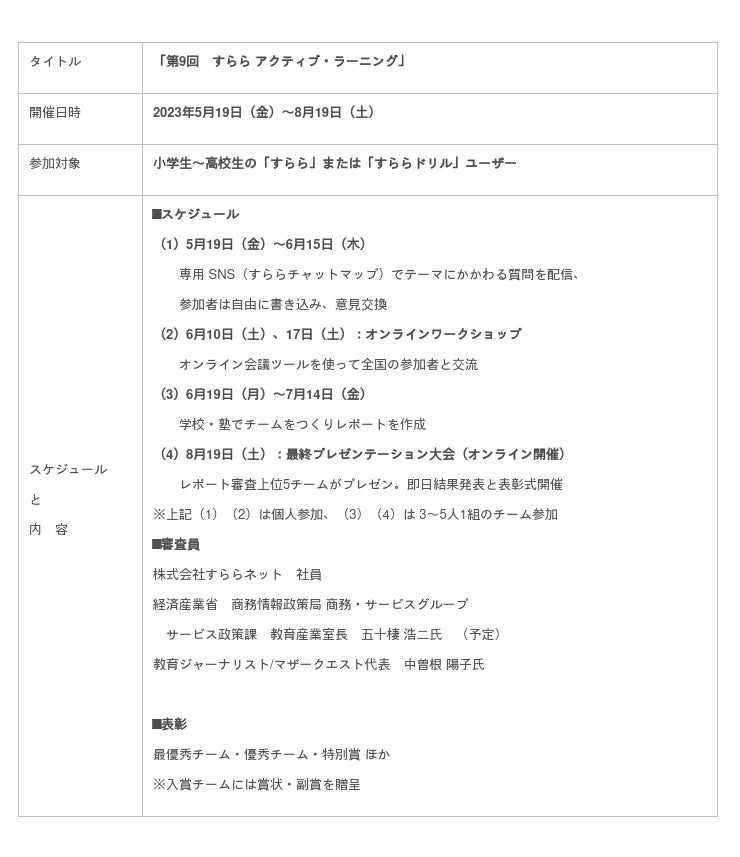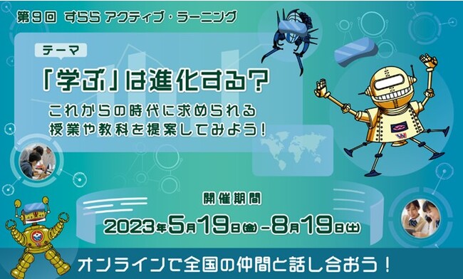 AIを活用したアダプティブな対話式 ICT 教材の開発と提供を行う株式会社すららネット(本社:東京都千代田区、代表取締役:湯野川孝彦)では、ICT の活用により学年・地域の垣根を越えて全国の参加者と共に、答えのない課題解決に向け学び合う探究型イベント「第9回 すらら アクティブ・ラーニング」を2023年5月19日(金)より開催します。