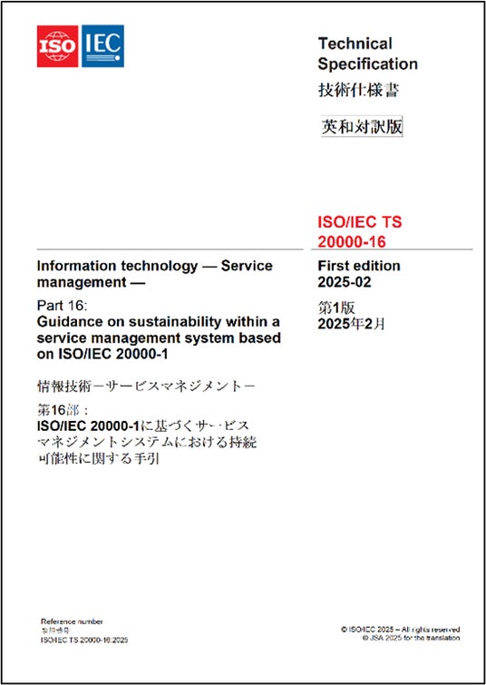 一般財団法人日本規格協会(本部:東京都港区、理事長:朝日弘)は、2025年8月1(金)に「ISO/IEC TS 20000-16:2025情報技術-サービスマネジメント-第16部:ISO/IEC 20000-1に基づくサービスマネジメントシステムにおける持続可能性に関する手引」の邦訳(英・日対訳版)を発行いたしました。