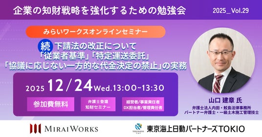 即戦力となるプロフェッショナル人材のマッチングサービス『フリーコンサルタント.jp』を展開する株式会社みらいワークス(本社:東京都港区、代表取締役社長 岡本 祥治、以下「当社」)は、2025年12月24日(水)、株式会社東京海上日動パートナーズTOKIO、弁護士法人内田・鮫島法律事務所と共催でオンラインセミナーを開催します。