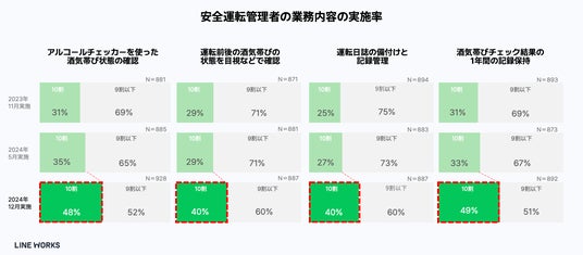道路交通法で定められた安全運転管理者の業務内容に関して、前々回、前回の調査から10ポイント以上上回る結果となりました。