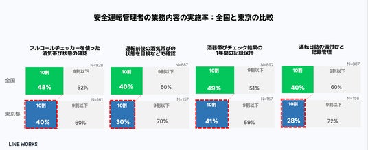 さらに、今回の調査では、道路交通法で定められた安全運転管理者の業務内容※について、東京都はすべての業務において100%実施の割合が全国を8ポイント以上、下回る結果となりました。東京都では公共交通機関が発達しているため、業務での車の利用率は全国平均と比較して低い傾向があり、アルコールチェック実施・管理の徹底が図りづらい状況が推測されます。