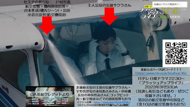 この度、阪神淡路大震災も経験した弊社理事長の戸村智憲が、ご縁あって日テレ日曜ドラマ「ブラッシュアップライフ」の航空監修(第9話・第10話(最終回))・ドラマ出演(2023年3月5日(日22:30~OA)第9話:セスナの教官役)・俳優陣の機内演技指導(安藤サクラさん・水川あさみさん・神保悟志さん)や、監督さん・プロデューサーさん・日テレさん関係各位への指導や、小道具提供(戸村の私物のパイロット機材など)の機会を得ました。