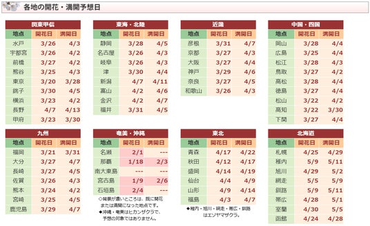 ■各地の開花・満開予想日