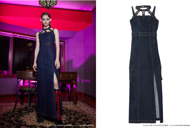 首元のベルトでナランチャ・ギルガを表現したデニムのロングドレス。高めのウエスト位置でスタイルアップ効果抜群。スニーカーなどを合わせて普段使いはもちろん、ヒールやジュエリーでオケージョンシーンにも活躍します。夏はさらりと一枚で、春先や秋口はインナーを合わせて、通年使い回せます。ナランチャピアスとの合わせもおすすめ。