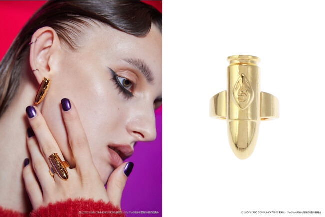 アニメ13話「マン・イン・ザ・ミラーとパープル・ヘイズ」より、P・Hの殺人ウイルスに侵された環境で生まれた蛇と、割れた拳のカプセルが指輪となって登場。危機的な状況を命がけの行動で回避したジョルノへの敬意を表現しました。存在感がありつつも繊細なデザインで、サイズは平均的な約11号サイズ。裏面はフリーサイズ仕様になっています。上品な色味のゴールドとシルバーの2色展開です。普段使いからオケージョンシーンまで、コーディネートを引き立てる定番のジュエリーとして通年活躍します。