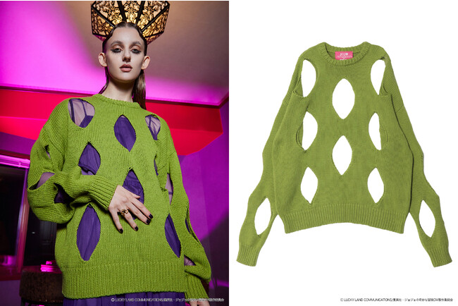 パンナコッタ・フーゴの着ているスーツのようなホールを編み立てたニットトップ。毛玉が出来にくく、ニット特有のチクチク感の無い編み糸を使用しており着心地も○。インナーに柄物や色物のトップスやワンピースを合わせて、幅広いレイヤードスタイルが楽しめます。スニーカーやデニムなどカジュアルな普段使いはもちろん、スカートなどのきれいめなスタイルにもおすすめです。