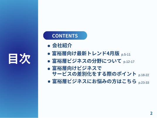 本レポートでは、富裕層のサービスの差別化をしたい方向けにマーケティングのアプローチ方法をご紹介しています。富裕層の集客にお困りの方にはおすすめの内容です。