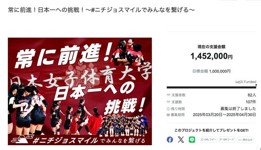 チーム・団体やアスリートを支援するスポーツ専門クラウドファンディングを展開するスポチュニティ株式会社(東京都 中央区、以下スポチュニティ)は、日本女子体育大学バレーボール部が主催するクラウドファンディング・プロジェクト『常に前進!日本一への挑戦!~#ニチジョスマイルでみんなを繋げる~』を実施し、支援金額1,452,000円(目標達成率145%)を達成して終了しました。