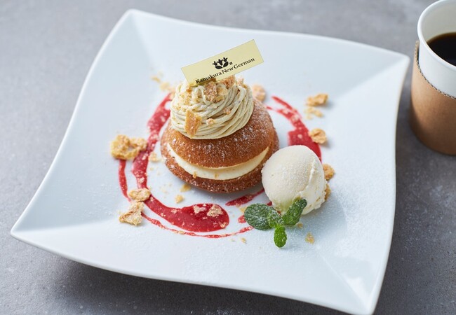カスタードクリームをたっぷり挟んだ「かまくらカスター」に和栗を使ったモンブランをトッピング。甘酸っぱいベリーソースとバニラアイスクリームで華やかにデコレーションをしました。