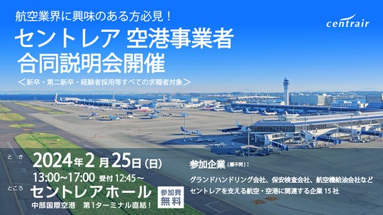 中部国際空港セントレア(以下セントレア)では、各種ハンドリング、保安検査、警備などを担う空港内事業者 計15社による「空港事業者合同説明会」を2024年2月25日(日)13時から開催します!