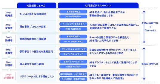 当社グループでは、生成AIの実務活用レベルをStep0からStep5の6つの段階に分けています。生成AI活用テストではStep0~Step2までの測定を、DIA ver3.0と組み合わせることで組織のAX推進者レベルであるStep3~5までを測定でき、AX人材の発掘と組織全体の変革推進につなげていくことが可能となります。