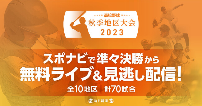 毎日新聞社は、北海道から九州まで全国10地区で争われる秋季高校野球地区大会で、準々決勝以上の合計70試合をヤフー株式会社が運営するスポーツ総合サイト「スポーツナビ」(https://baseball.yahoo.co.jp/hsb_autumn/competitions/)で無料ライブ配信します。試合後にはダイジェストや見逃し動画も配信。来春のセンバツ出場校を選ぶ際の参考資料にもなる熱戦を、スマホやタブレット端末、PCでお楽しみください。