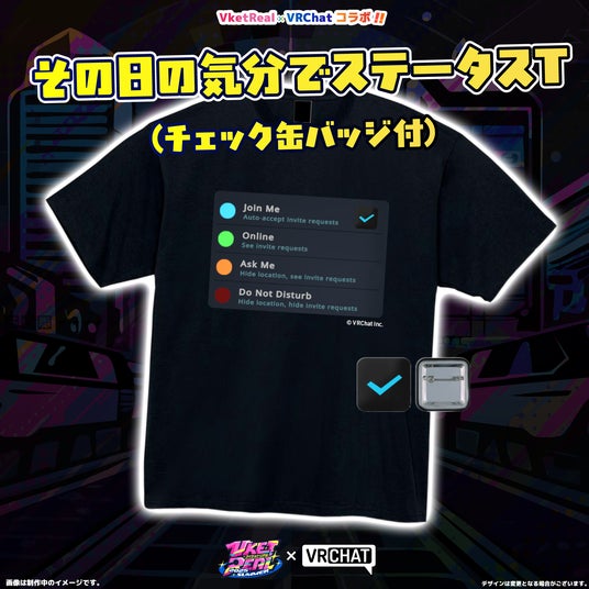 ◇その日の気分でステータスT(チェック缶バッジ付)VRChatのステータスメニューを前面にデザインしたTシャツです!