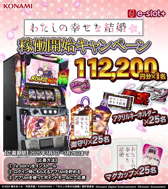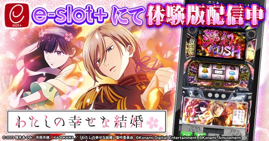 株式会社コナミアミューズメントは、7月7日(月)からスマスロ新機種『パチスロ わたしの幸せな結婚』が稼働開始することに合わせて、スマートフォンアプリ「e-slot+(イースロットプラス)」にて体験版を同日から無料配信することをお知らせします。