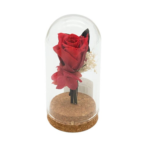 ガラスドームの中に、プチサイズのプリザーブドフラワーのバラが入ったアレンジメントです。本体サイズ(約):径75×120mm