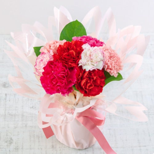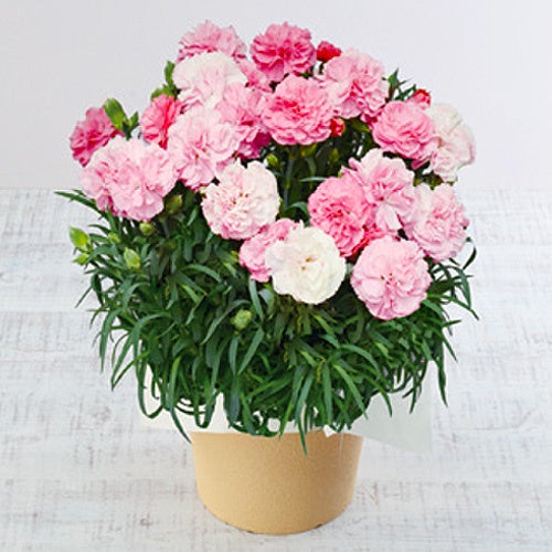 母の日定番のフラワーギフト(鉢花)です。鮮やかなピンクからミルクのように濃厚な白色へ変化する大輪カーネーションの鉢です。見ごたえのある大きな花が魅力です。
