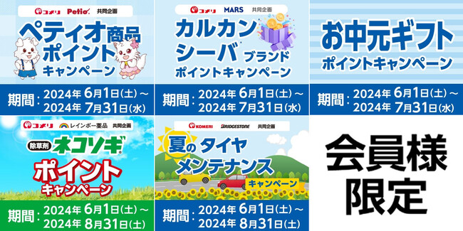 ホームセンターの「コメリパワー」や「コメリハード&グリーン」を通し地域のライフラインとして、地元のプロを応援する株式会社コメリ(所在地:新潟県 新潟市、代表取締役社長:捧 雄一郎)は、コメリの決済手段「コメリカード」「アクアカード」会員様向けに、2024年6月から5種のキャンペーンを新たに開催いたします。